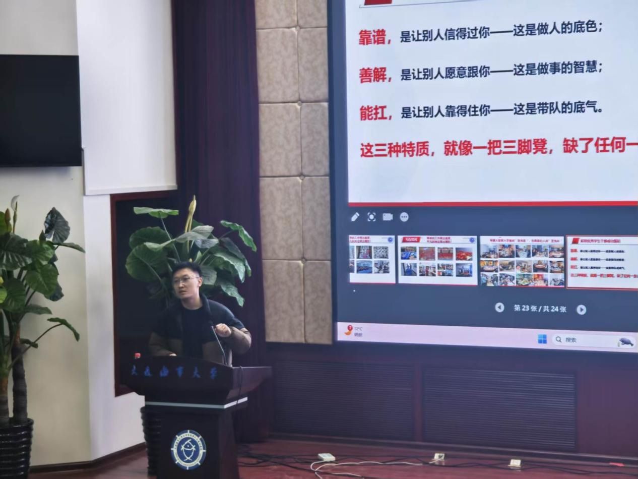 指导员薛航,以 《守初心 担使命 善作为——解锁优秀学生干部的成长密码》为主题作讲座。他结合工作经验,从 “初心使命”“责任担当”“方式方法” 三个维度切入,用大量生动的案例,为同学们解锁了如何成为一名优秀学生干部的“通关密码”:学生干部不仅是一种身份,更是一种责任,要时刻守住为同学服务的初心,在关键时刻站得出来、顶得上去,更要善于思考、讲究方法,在成就他人的同时实现自我价值的提升。